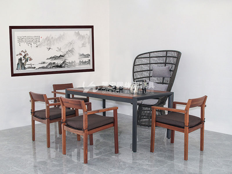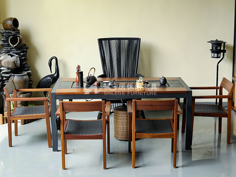 特点: 产品特性 1、桌面采用南美柚木,桌面上的木纹清晰可见,整体美观耐用,简约大方。 2、桌面上刻有道德经的啱石茶台,纹路清晰,喝茶的闲余可使用毛刷在上临摹。 3、桌腿是采用优质铝合金做支架,防生锈。 4、结实耐用 抗老化。 产品范围 花园、阳台、露台、庭院、别墅、酒店休闲区、度假村、户外休闲区、茶室等