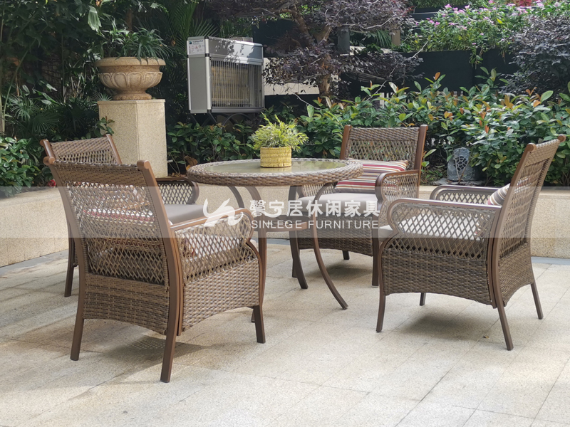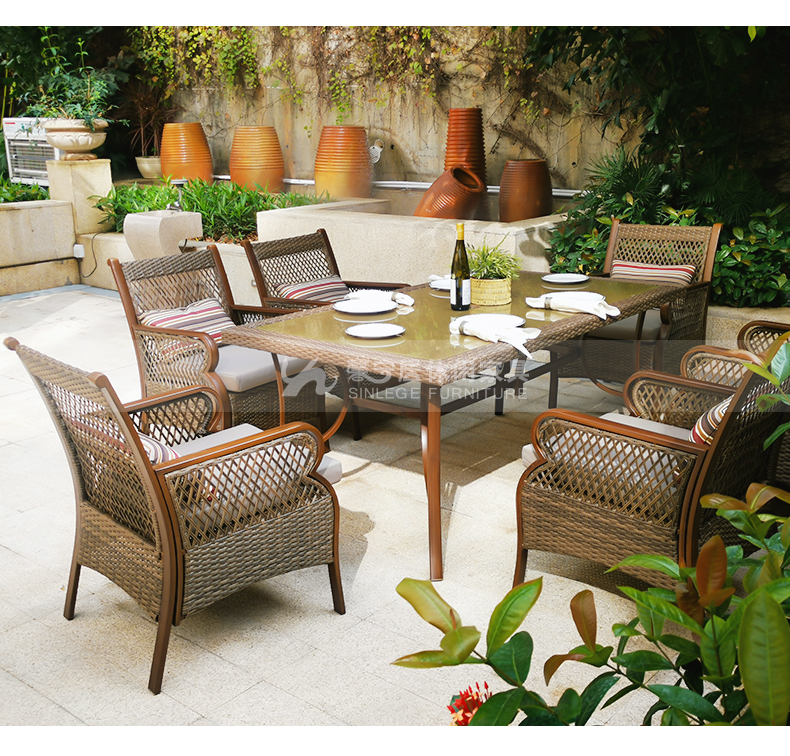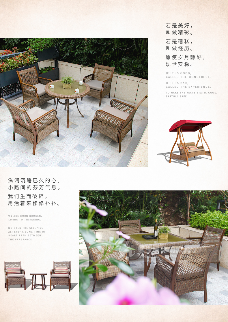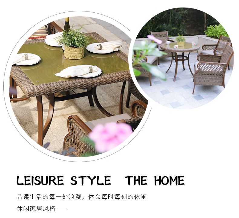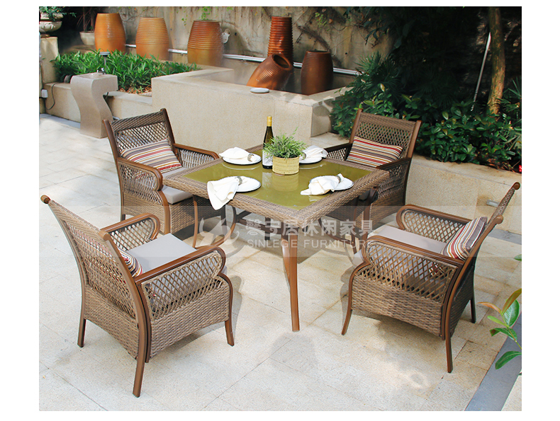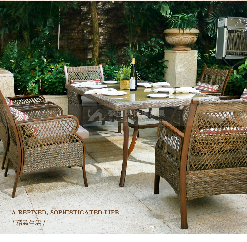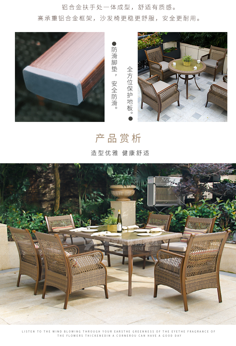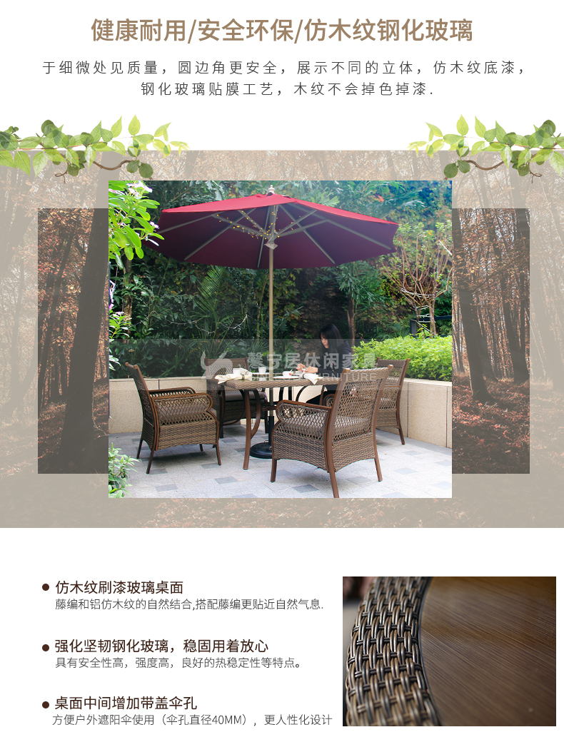 特点:纯手工编织方木色藤条,简洁大方,桌:配有仿木纹钢化玻璃,椅:优质铝合金,经久耐用。