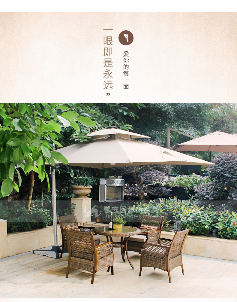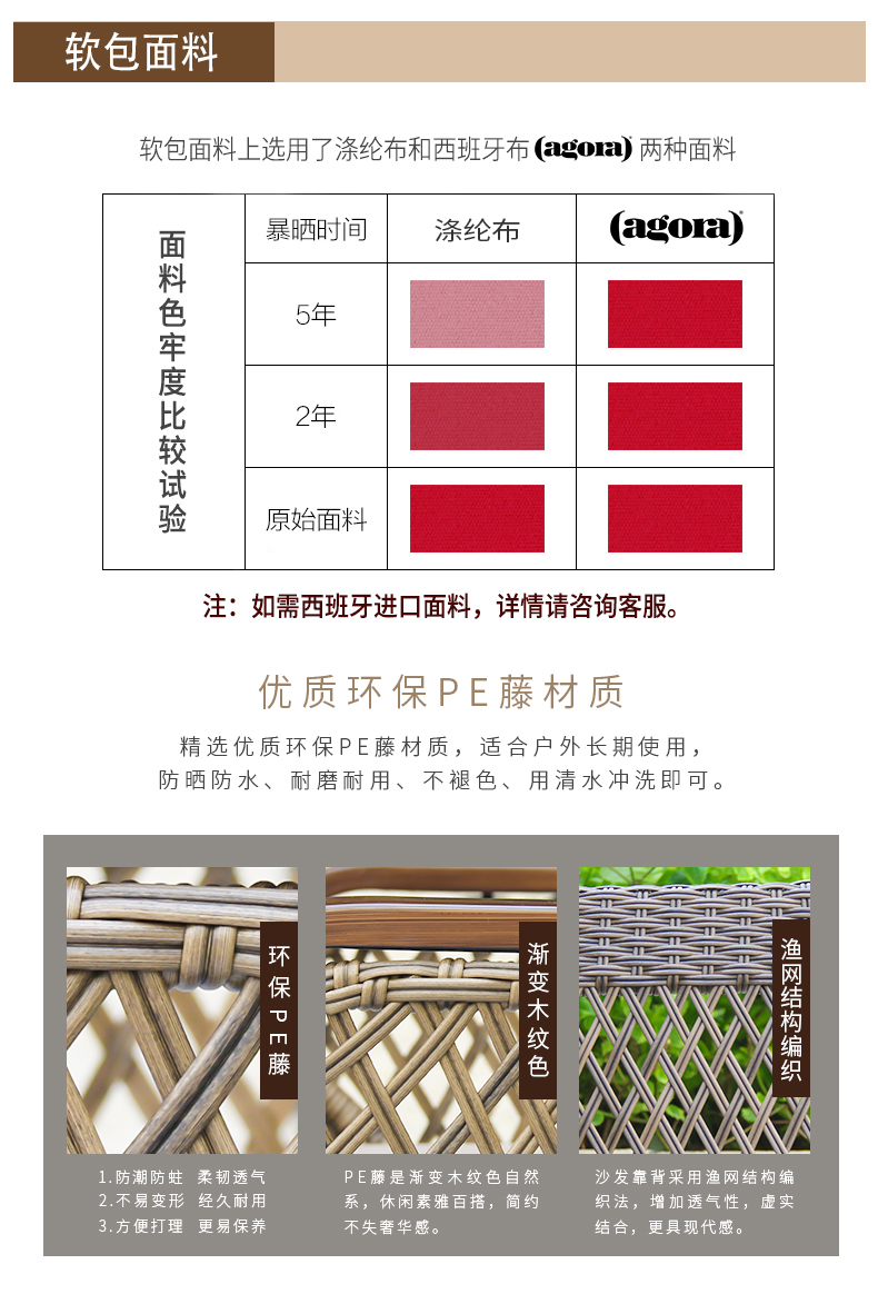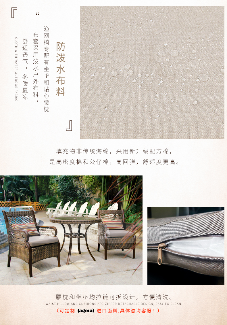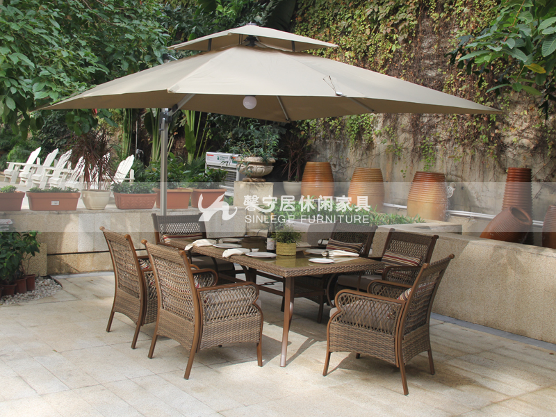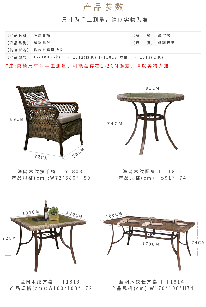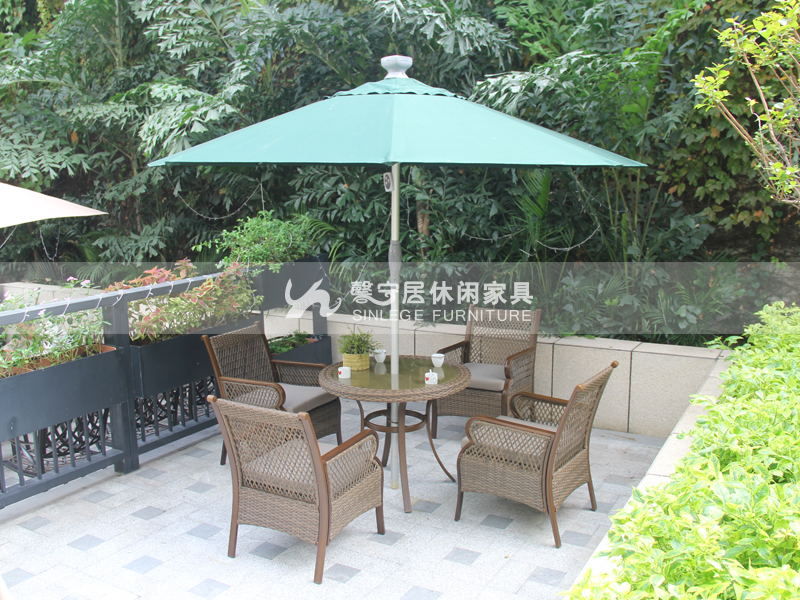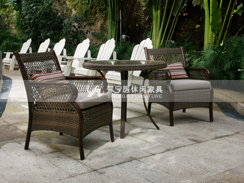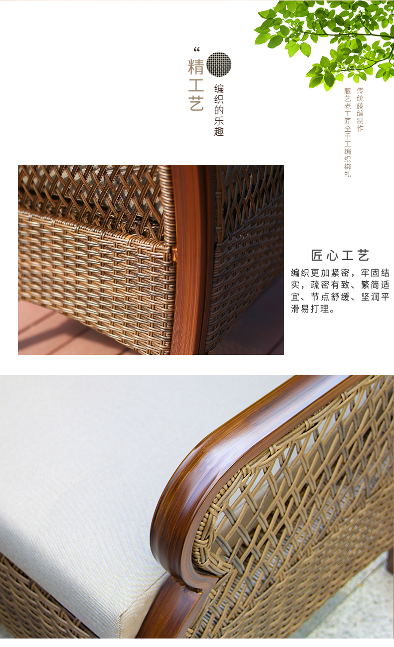 特点:纯手工编织方木色藤条,简洁大方,桌:配有仿木纹钢化玻璃,椅:优质铝合金,经久耐用。