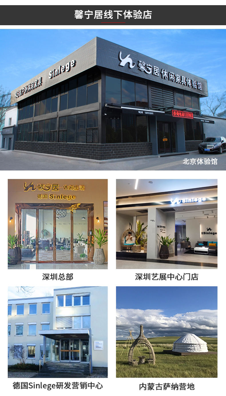 “馨宁居”从1998年涉足户外休闲产业。2006年在北京设立了休闲家具独立体验馆,公司国内营销总部位于深圳。我们倡导一种健康、自然、时尚的全新休闲生活方式。“馨宁居”品牌产品涵盖了休闲家具、户外遮阳、庭院休闲配套三大系列近千个品种。