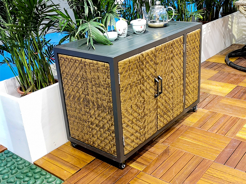 特点: 名称 移动茶台 型号 YM-T1904a 材质 铝+PE藤 尺寸 L960*W460*H700mm 适用场所 花园、阳台、客厅、庭院、别墅等