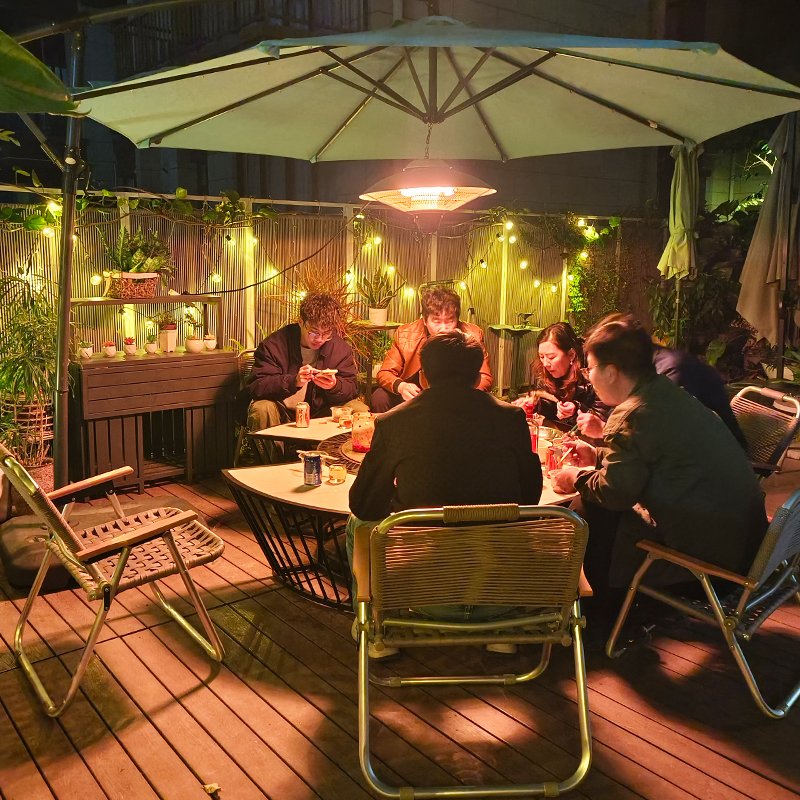 夜幕降临,繁星点点,架起烤火炉,肉串滋滋作响,亲友围坐,欢笑在夜色中回荡。