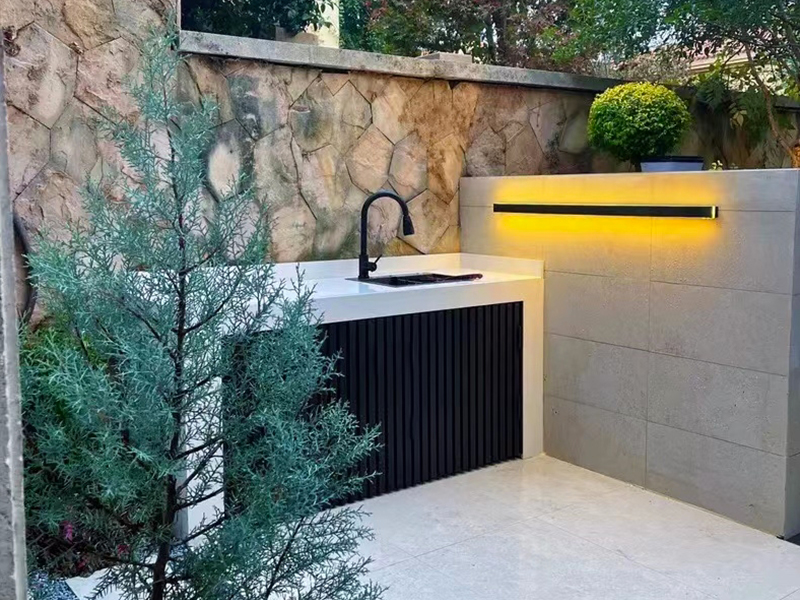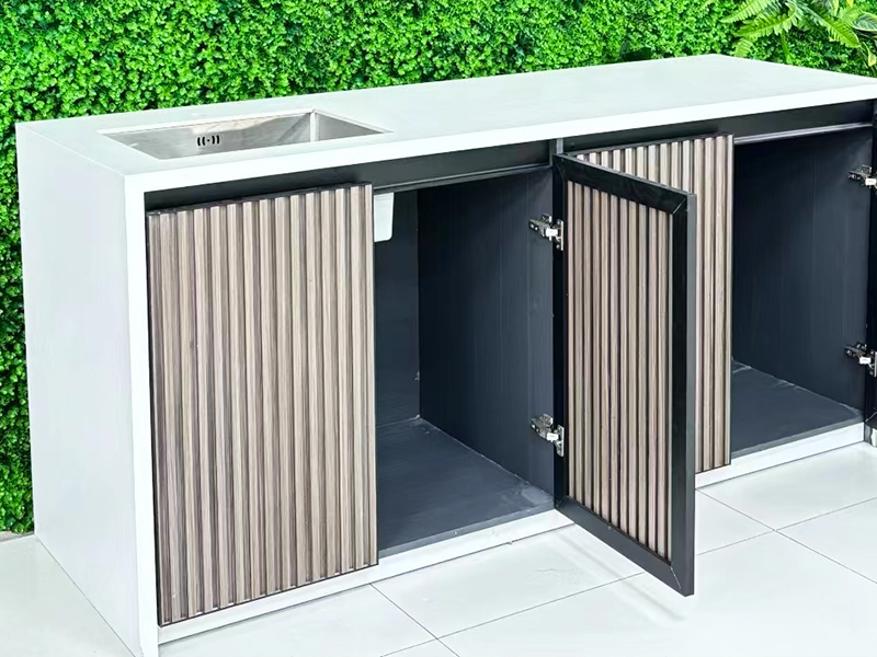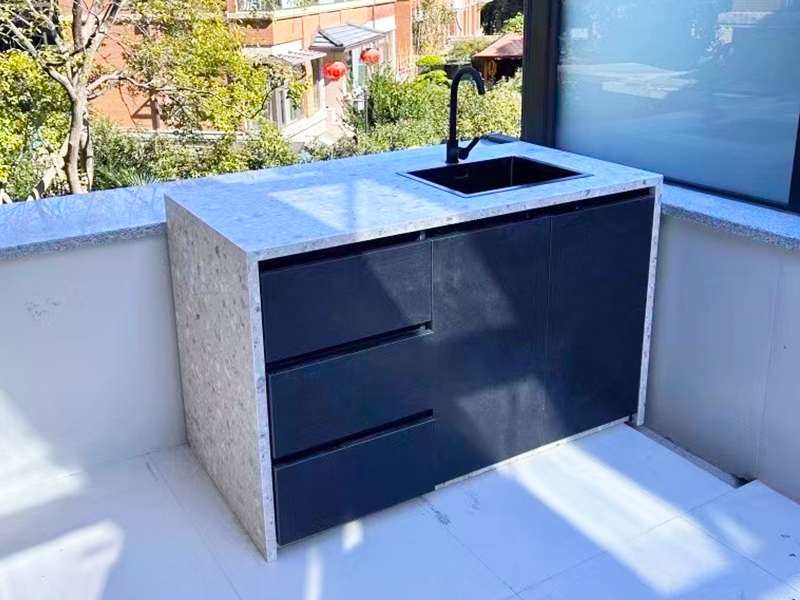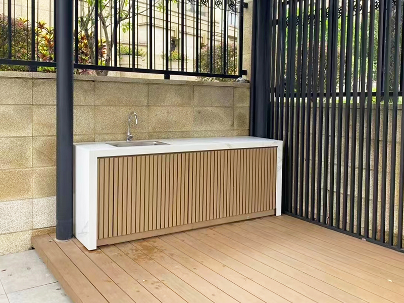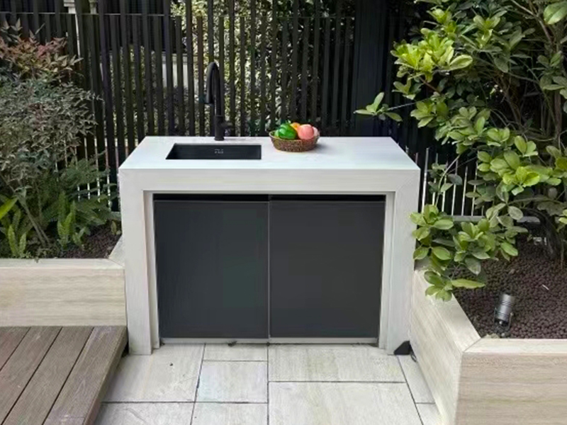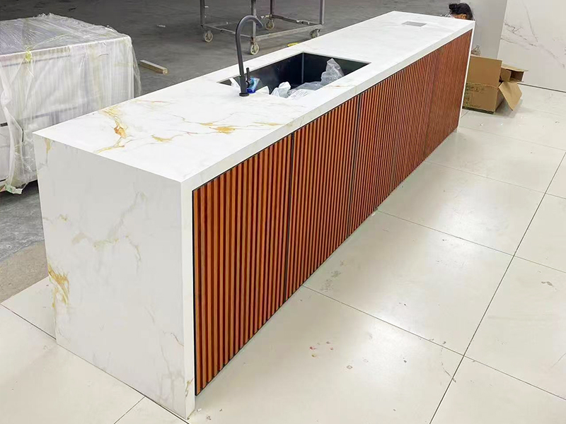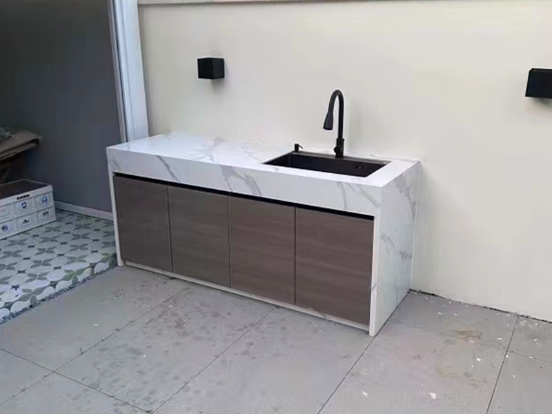 特点:洗手台 一、材质说明: 1、框架全铝合金 2、柜体:全铝合金或木板材柜体 3、台面:岩板 4、柜门:(1)铝合金格栅 (2)岩板+蜂巢板+铝塑板 门板厚度20mm,9mm岩板+蜂巢板6mm+5mm铝塑板 常规尺寸:高度850mm,宽度600mm(可定制)
