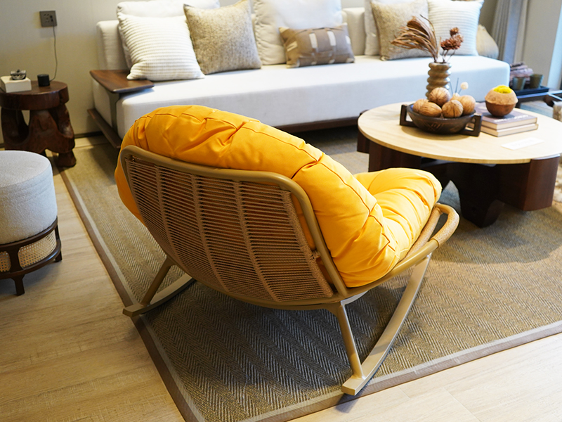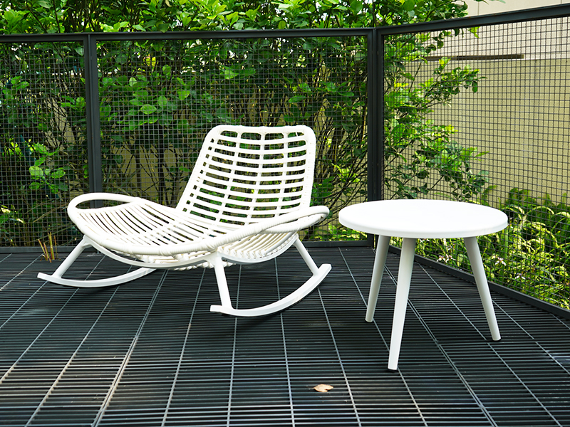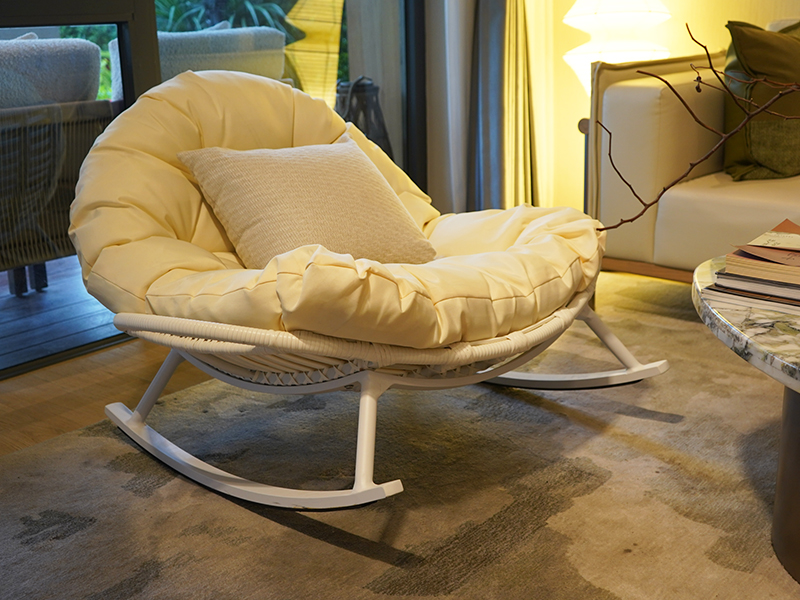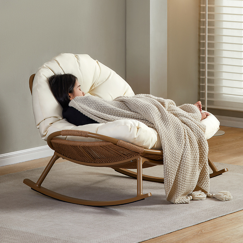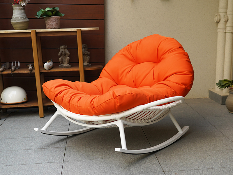 特点: 名称 贝壳摇椅 型号 TY-2401 尺寸 L1030*D970*H680mm 材质 铝合金+PE藤