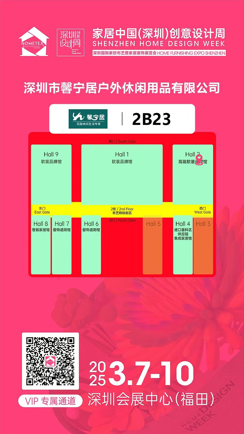 3月7-10日,2025家居中国(深圳)创意设计周暨深圳国际家纺家居展,将在深圳会展中心(福田)盛大举行,13万展览面积,1000多家品牌企业集结,12万余家居及跨界买家聚焦深圳。锦若繁华,璀璨绽放,馨宁居休闲家具2号馆2B23展台,欢迎莅临!