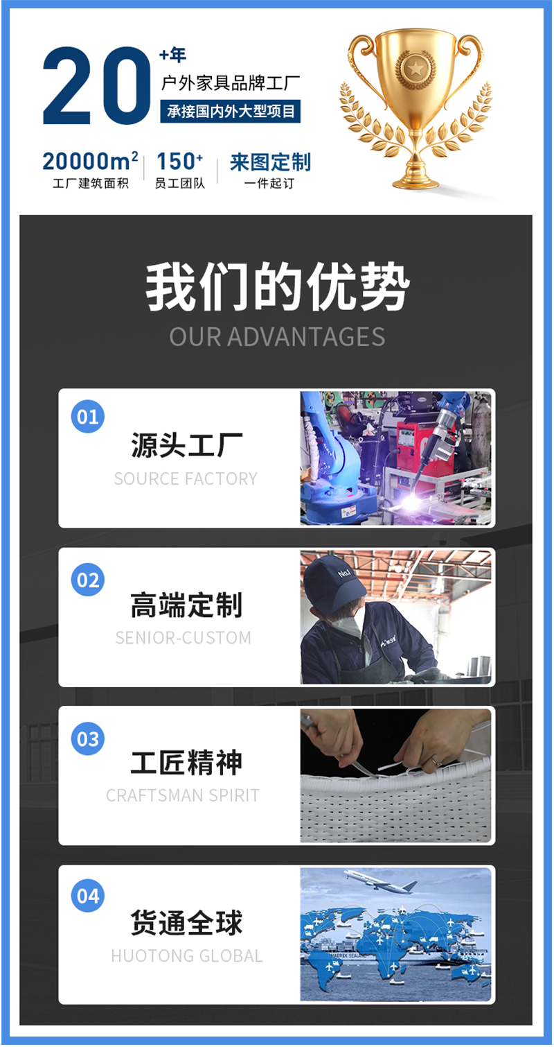 设计师有感于原始森林粗藤细蔓的户外旖旎,原料主要用环保粗圆仿藤、细圆仿藤、片仿藤与铝合金框架相结合,结合中国传统几千年的竹编工艺,打造了这一系列有浓郁“花园城堡、庭院秋千,藤艺桌椅”特色的休闲家具产品。