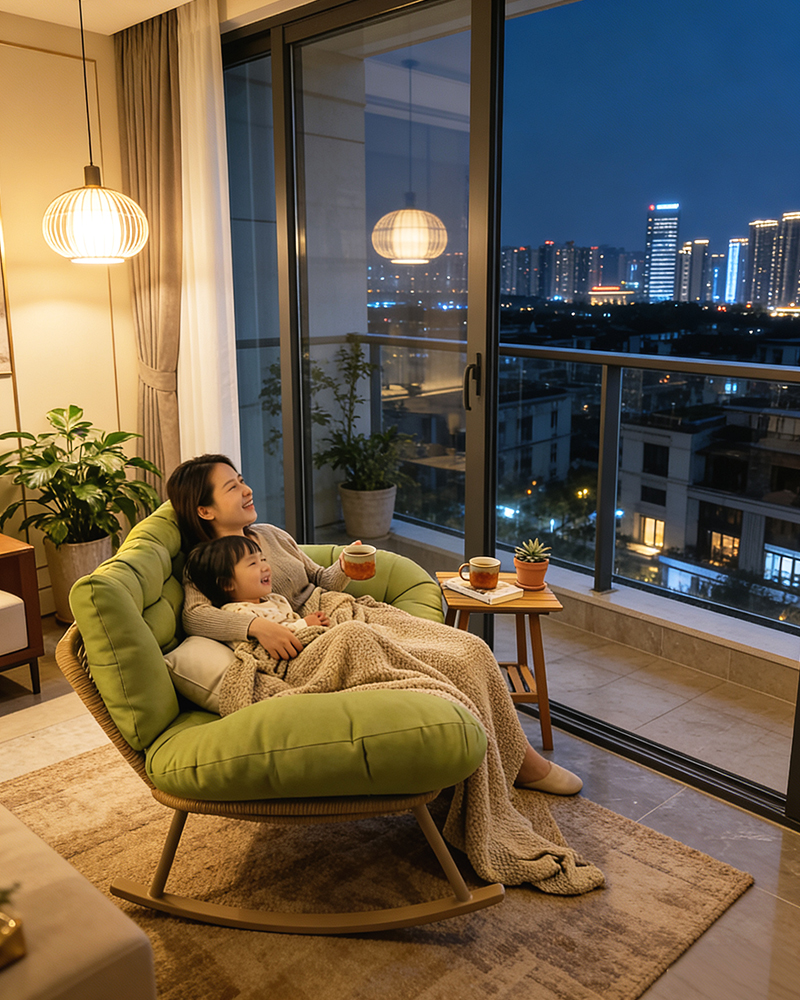 添加轻薄纱帘,轻松调节光线。傍晚时分,一串暖光小夜灯,靠着摇摇椅让阳台温柔入夜。